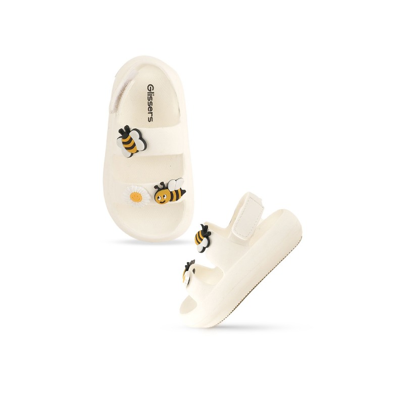 A pair of White, Yellow & Black bee and daisySandals Sole Material - EVA Cushioned footbed Features: Water-friendly and quick to wipe clean. textured anti-skid/non-slip outsole.lightweight EVA. cushioned footbed, breathable open-toe design, and a secure hook-and-loop Velcro backstrap Size & Fit Fit Foot Length :17.4 cm Material & Care EVA Wipe with clean dry cloth Specifications Type Comfort Sandals Fastening Velcro Sole Material EVA