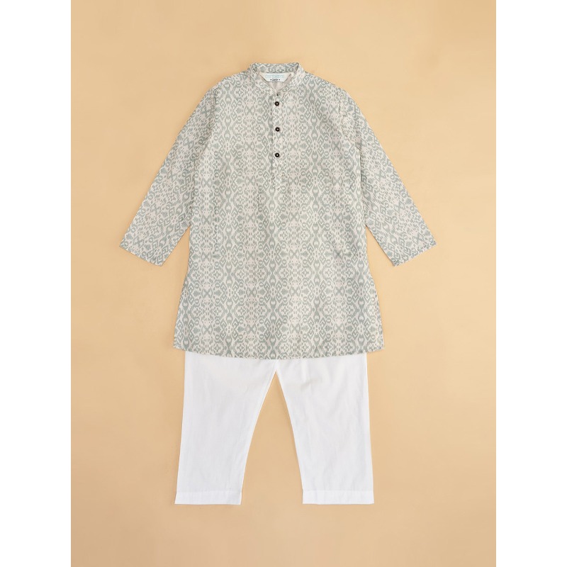 Off white & grey kurta with trousers Kurta design: Ethnic motifs printed Straight shape Regular style Mandarin collar Long regular sleeves 2 pockets Knee length with straight hem Pure cotton machine weave fabric Trousers design: Solid trousers Elasticated waistband Slip-on closure Material & Care Top Fabric: Pure Cotton Bottom Fabric: Pure Cotton Hand Wash Specifications Sleeve Length Long Sleeves Top Shape Straight Top Type Kurta Bottom Type Trousers Top Pattern Printed Top Design Styling Regular Top Hemline Straight Top Length Knee Length Neck Mandarin Collar Bottom Pattern Solid Bottom Closure Slip-On Waistband Elasticated Weave Pattern Regular Weave Type Machine Weave Pattern Coverage Large Number of Items 2