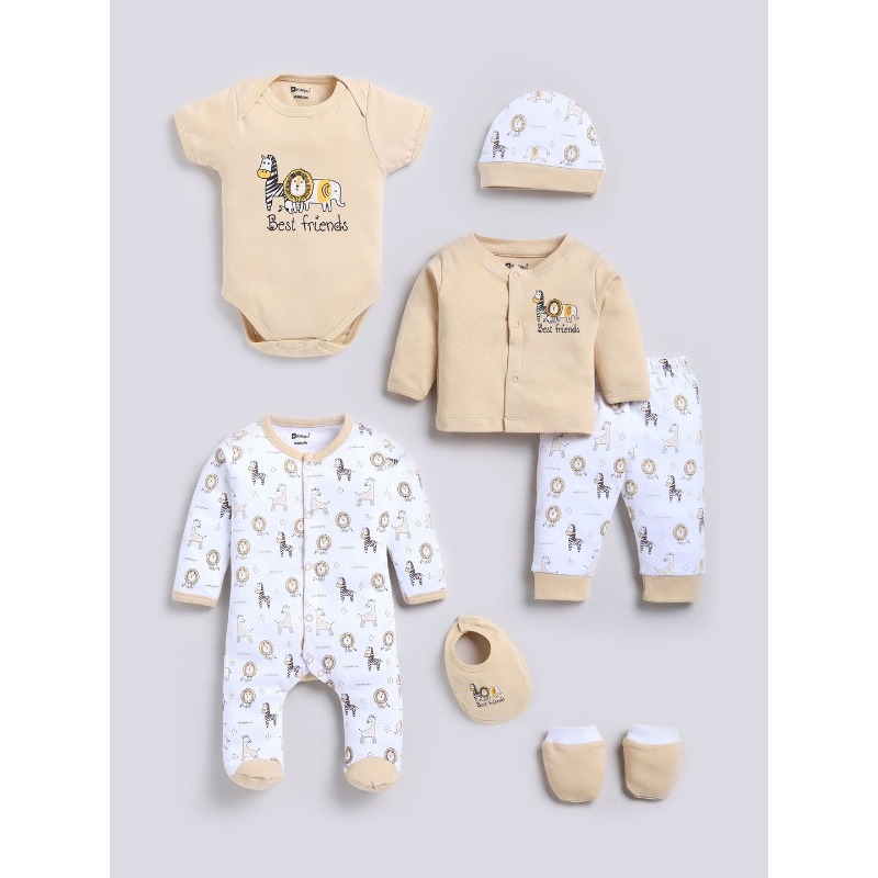 This set consists of 1 bodysuit, 1 sleepsuit, 1 night suit, 1 pair of socks, 1 bib and 1 cap Beige printed bodysuit, has an envelope neck, short sleeves, snap button closures at the crotch area White printed sleepsuit, has a round neck, snap button closures along the crotch area and legs, long sleeves, and attached footies A pair of Beige patterned ankle-length socks Beige printed bib White printed cap White & beige printed nightwear consists of shirt and pyjama Beige printed shirt, has round neck, short sleeves with button closure and straight hem White printed pyjama, has a slip-on closure Material & Care Pure Cotton Machine Wash Specifications Fabrics Pure Cotton Net Quantity Unit Pieces Number of Pieces 7 Piece Sustainable Regular